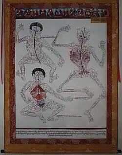 Later in the 11th and 12th centuries, a number of additional Indian medical texts were also transmitted.[8] While the Ayurvedic Astāngahrdayasamhitā or the Heart of Medicine Compendium attributed to Vagbhata was translated into Tibetan by Rinchen Zangpo (རིན་ཆེན་བཟང་པོ།) (957–1055),[9] Ayurvedic practices had already been adopted in the 8th century by the Tibetan medical Council. Tibet had also absorbed the early Indian Abhidharma literature, for example the 5th century Abhidharmakosasabhasyam by Vasubandhu, which expounds upon medical topics, such as fetal development.[10] A wide range of Indian Vajrayana tantras, containing practices based on medical anatomy, had likewise been adopted by Tibet.[11][12]