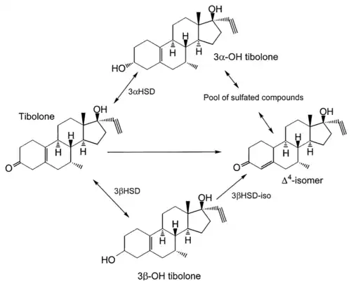 - ↑ Wang M, Ebmeier CC, Olin JR, Anderson RJ (May 2006). "Sulfation of tibolone metabolites by human postmenopausal liver and small intestinal sulfotransferases (SULTs)". Steroids. 71 (5): 343–351. doi:10.1016/j.steroids.2005.11.003. PMID 16360722. S2CID 92612.