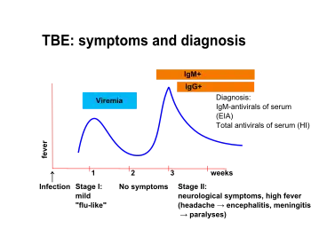 The disease is most often biphasic. After an incubation period of approximately one week (range: 4–28 days) from exposure (tick bite) non-specific symptoms occurs. These symptoms are fever, malaise, headache, nausea, vomiting and myalgias that persist for about 5 days.[2][1][6] Then, after approximately one week without symptoms, some of the infected develop neurological symptoms, i.e. meningitis, encephalitis or meningoencephalitis. Myelitis also occurs with or without encephalitis.[2][1][6][7]