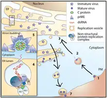 The viral polyprotein is translated and inserts into the ER membrane, where it is processed on the cytosolic side by host peptidases and in the lumen by viral enzyme action. The viral proteins C, NS3, and NS5 are cleaved into the cytosol (though NS3 can complex with NS2B or NS4A to perform proteolytic or helicase activity), while the remaining nonstructural proteins alter the structure of the ER membrane. This altered membrane permits the assembly of replication complexes, where the viral genome is replicated by the viral RNA-dependent RNA polymerase, NS5.[9][6]