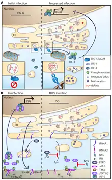 With the exception of food-borne cases, infection begins in the skin at the site of the tick bite. Skin dendritic (or Langerhans) cells (DCs) are preferentially targeted.[6] Initially, the virus replicates locally and immune response is triggered when viral components are recognized by cytosolic pattern recognition receptors (PRRs), such as Toll-like receptors (TLRs).[10] Recognition causes the release of cytokines including interferons (IFN) α, β , and γ and chemokines, attracting migratory immune cells to the site of the bite.[6] The infection may be halted at this stage and cleared, before the onset of noticeable symptoms. Notably, tick saliva enhances infection by modulating host immune response, dampening apoptotic signals.[10] If the infection continues, migratory DCs and macrophages become infected and travel to the local draining lymph node where activation of polymorphonuclear leukocytes, monocytes and the complement system are activated.[10]
