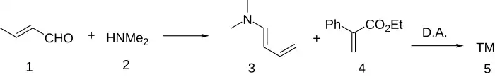 The condensation between Crotonaldehyde (1) and dimethylamine (2) give dimethylaminobutadiene [139943-10-5] (3). The Diels-Alder reaction with ethyl atropate [22286-82-4] (4) yields a mixture of isomers, of which only the (E)-(trans)-isomers are active.