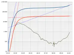 Number of cases (blue) and number of deaths (red) on a logarithmic scale.