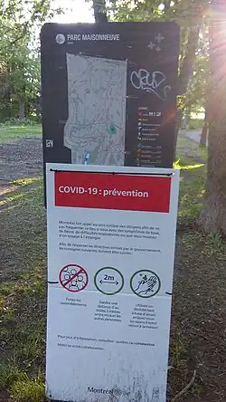 May 3 – As Montrealers experienced two consecutive days of +20 °C (68 °F) weather[64] and began crowding into parks, the city announced the closure of the parking lots at La Fontaine Park, Maisonneuve Park, Jarry Park, Frédéric-Back Park, and the Île de la Visitation nature park, effective May 3, 2020.[65][66]