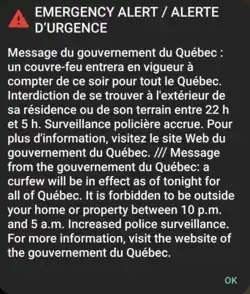 - ↑ "COVID-19: Quebec brings back nightly curfew, private gatherings prohibited, as cases soar". Global News. December 30, 2021. Retrieved December 31, 2021.