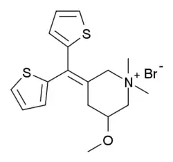 Timepidium bromide (INN) is an anticholinergic. It is used in the symptomatic treatment of visceral spasms.[1] It is also used to relieve pain associated with various gastrointestinal disorders.[2] The quaternary nitrogen prevents it from crossing the blood brain barrier, so it is peripherally acting with no central side effects.