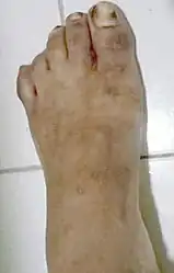 | Symptoms | One or more dark brown, painless spots on palms or soles[2] |