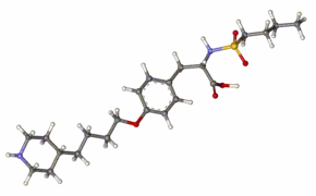 Tirofiban is a synthetic, non-peptide inhibitor of the interaction of fibrinogen with the integrin glycoprotein (GP) IIb/IIIa on human platelets. The Merck chemistry team of George Hartman, Melissa Egbertson and Wasyl Halczenko developed tirofiban from a lead compound discovered in focused screening of small molecule replacements of the key arginine-glycine-aspartic acid (Arg-Gly-Asp) subunit of fibrinogen. Computation of the distance between the charged Arg and Asp sites in fibrinogen provided guidance leading to directed screening success. Tirofiban constitutes an antithrombotic, specifically an inhibitor of platelet aggregation.