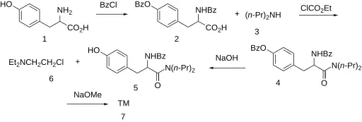 The acylation of racemic tyrosine (1) with benzoyl chloride gives N,O-dibenzoyl-tyrosine (2). Amide formation with dipropylamine (3) using the mixed anhydride method gives the intermediate (4). Hydrolysis of the phenolic ester with sodium hydroxide forms (5), which is alkylated with ClCH2CH2N(CH2CH3)2 to produce the ether tiropramide.[2][3]