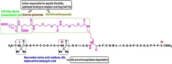 The fatty-diacid section (eicosanedioic acid) is linked via a glutamic acid and two (2-(2-aminoethoxy)ethoxy)acetic acid units to the side chain of the lysine residue. This arrangement allows for a much longer half life, extending the time between doses, because of its high affinity to albumin.[17]