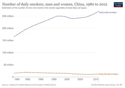 The consumption of tobacco products and its harmful effects affect both smokers and non-smokers,[7] and is a major risk factor for six of the eight leading causes of deaths in the world, including respiratory diseases, cardiovascular diseases, cerebrovascular diseases, periodontal diseases, teeth decay and loss, over 20 different types or subtypes of cancers, strokes, several debilitating health conditions, and malignant diseases.[2][3][4][5][6][8][9] In high income countries, smoking rates have been reduced mostly by reducing the uptake of smoking among younger people rather than improving the rates of quitting among established smokers. It is, however, mostly current smokers who will face disease and death from smoking.[10][11]