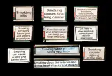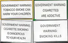 - ↑ "Warnings & Packaging". The Tobacco Atlas. World Lung Foundation. 2015. Archived from the original on 6 September 2015. Retrieved 31 May 2016.