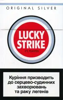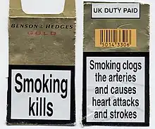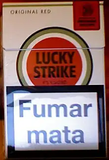 Tobacco package warning messages are warning messages that appear on the packaging of cigarettes and other tobacco products concerning their health effects. They have been implemented in an effort to enhance the public's awareness of the harmful effects of smoking. In general, warnings used in different countries try to emphasize the same messages. Warnings for some countries are listed below. Such warnings have been required in tobacco advertising for many years, with the earliest mandatory warning labels implemented in the United States in 1966.[2] Implementing tobacco warning labels has been strongly opposed by the tobacco industry, most notably in Australia, following the implementation of plain packaging laws.