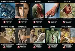 In 2001, Brazil became the second country in the world and the first country in Latin America to adopt mandatory warning images in cigarette packages.[16] Warnings and graphic images illustrating the risks of smoking occupy 100% of the back of cigarette packs. In 2008, the government enacted a third batch of images[17] aimed at younger smokers.[16] The rule was in force for nine years until 2017, when yet another batch of warnings were introduced. They contain images as equally disturbing as the previous ones but also contain subtle messages such as "Você morre" (You die), "Você sofre" (You suffer) and "Você adoece" (You get sick).