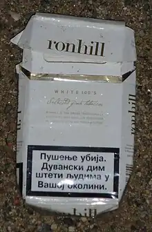 Before 2011, a small warning with the text Pušenje je štetno za zdravlje (Smoking is harmful to health) was printed on the back of cigarette packets.