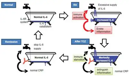 Besides other functions, interleukin 6 (IL-6) is involved in the development of immunological and inflammatory reactions. Some autoimmune diseases like RA are associated with abnormally high IL-6 levels. Tocilizumab binds soluble as well as membrane bound interleukin-6 receptors, hindering IL-6 from exerting its pro-inflammatory effects.[24][26] It has been noted that the membrane bound form and soluble form of the IL-6 receptor may have different effects in the pathogenesis of rheumatoid arthritis with the soluble form being more implicated in disease progression.[27]