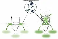 A toilet plume is the invisible to the naked eye, cloud-like dispersal of potentially infectious sewage particles as a result of flushing a toilet.[1] Flush particles rapidly rise out of the bowl and several feet into the air after flushing. Aerosolized droplets can remain suspended in the air for tens of minutes between users. These invisible particles go on to coat and spread onto surfaces like floors and counters; or objects like hand towels, bathmats or even toothbrushes. Daily use of a toilet by healthy individuals is considered to pose a lower health risk in terms of infection. However, if an individual is immunocompromised and the previous user was sick and shed out quantities of an infectious virulent pathogen (virus or bacteria) in their urine, feces or vomitus that would be sufficient for infection, a significantly greater risk may arise to the immunocompromised individual.