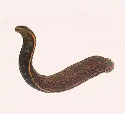 Historically, the European medicinal leech, another invertebrate parasite, has been used in medicine to remove blood from patients.[47] They have three jaws (tripartite) that resemble saws in both appearance and function, and on them are about 100 sharp teeth used to incise the host. The incision leaves a mark that is an inverted Y inside of a circle. After piercing the skin and injecting anticoagulants (hirudin) and anaesthetics, they suck out blood, consuming up to ten times their body weight in a single meal.[48]