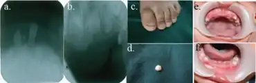 | a) Mandibular anterior permanent germ b) maxillary anterior permanent germ c) toenails are spoon–shaped d) mandibular primary canine e,f)absence of all maxillary primary incisors | |