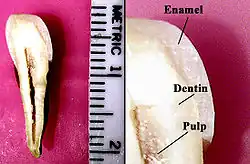 The basic unit of enamel is called an enamel rod.[7] Measuring 4–8 μm in diameter, an enamel rod, formally called an enamel prism, is a tightly packed mass of hydroxyapatite crystallites in an organized pattern.[2] In cross section, it is best compared to a keyhole, with the top, or head, oriented toward the crown of the tooth, and the bottom, or tail, oriented toward the root of the tooth.