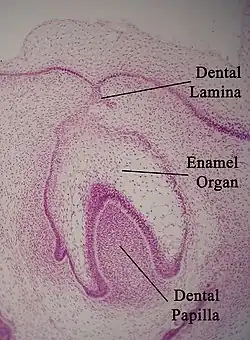 Enamel formation is part of the overall process of tooth development. Under a microscope, different cellular aggregations are identifiable within the tissues of a developing tooth, including structures known as the enamel organ, dental lamina, and dental papilla.[15] The generally recognized stages of tooth development are the bud stage, cap stage, bell stage, and crown, or calcification, stage. Enamel formation is first seen in the crown stage.