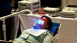 Power or light-accelerated bleaching uses light energy which is intended to accelerate the process of bleaching in a dental office. Different types of energy can be used in this procedure, with the most common being halogen, LED, or plasma arc. Use of light during bleaching increases the risk of tooth sensitivity and may not be any more effective than bleaching without light when high concentrations of hydrogen peroxide are used.[35] A 2015 study showed that the use of a light activator does not improve bleaching, has no measurable effect, and rather is likely to increase the temperature of the associated tissues, resulting in damage.[36][37]