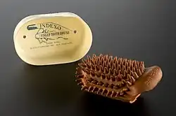 The first bristle toothbrush resembling the modern one was found in China.[18] Used during the Tang dynasty (619–907), it consisted of hog bristles.[19] The bristles were sourced from hogs living in Siberia and northern China because the colder temperatures provided firmer bristles. They were attached to a handle manufactured from bamboo or bone, forming a toothbrush.[8] In 1223, Japanese Zen master Dōgen Kigen recorded in his Shōbōgenzō that he saw monks in China clean their teeth with brushes made of horsetail hairs attached to an oxbone handle. The bristle toothbrush spread to Europe, brought from China to Europe by travellers.[20] It was adopted in Europe during the 17th century.[21] The earliest identified use of the word toothbrush in English was in the autobiography of Anthony Wood who wrote in 1690 that he had bought a toothbrush from J. Barret.[22] Europeans found the hog bristle toothbrushes imported from China too firm and preferred softer bristle toothbrushes made from horsehair.[8] Mass-produced toothbrushes made with horse or boar bristle continued to be imported to Britain from China until the mid 20th century.[6]