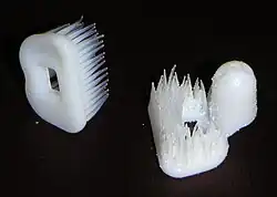 The small round brush head comprises seven tufts of tightly packed soft nylon bristles, trimmed so the bristles in the center can reach deeper into small spaces. The brush handle is ergonomically designed for a firm grip, giving the control and precision necessary to clean where most other cleaning aids cannot reach.[48] These areas include the posterior of the wisdom teeth (third molars), orthodontic structures (braces), crowded teeth, and tooth surfaces that are next to missing teeth. It can also be used to clean areas around implants, bridges, dentures and other appliances.[49]