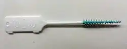 An interdental or interproximal ("proxy") brush is a small brush, typically disposable, either supplied with a reusable angled plastic handle or an integral handle, used for cleaning between teeth and between the wires of dental braces and the teeth.