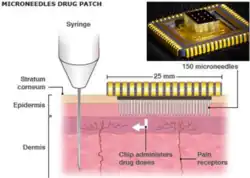 - ↑ Dharadhar, Saili; Majumdar, Anuradha; Dhoble, Sagar; Patravale, Vandana (2019-02-01). "Microneedles for transdermal drug delivery: a systematic review". Drug Development and Industrial Pharmacy. 45 (2): 188–201. doi:10.1080/03639045.2018.1539497. ISSN 0363-9045. PMID 30348022. S2CID 53039251.