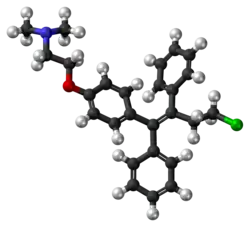 The medication is a selective estrogen receptor modulator (SERM) and hence is a mixed agonist–antagonist of the estrogen receptor (ER), the biological target of estrogens like estradiol.[5][8] It has estrogenic effects in bone, the liver, and the uterus and antiestrogenic effects in the breasts.[9][10][11][5] It is a triphenylethylene derivative and is closely related to tamoxifen.[12]