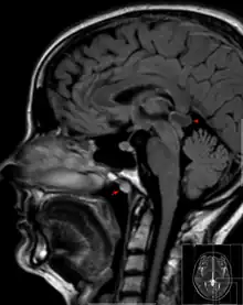 | Tornwaldt cyst imaged on sagittal MRI (FLAIR). The cyst appears hyperintense in the midline of the nasopharynx (arrow). In this case there is also a cyst of the pinealis gland (arrowhead) showing a signal intensity slightly higher than the CSF. | |