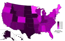 The total fertility rate in the United States after World War II peaked at about 3.8 children per woman in the late 1950s, dropped to below replacement in the early 70s, and by 1999 was at 2 children.[46] Currently, the fertility is below replacement among those native born, and above replacement among immigrant families, most of whom come to the United States from countries with higher fertility. However, the fertility rate of immigrants to the United States has been found to decrease sharply in the second generation, correlating with improved education and income.[47] In 2021, U.S. TFR was 1.8, ranging between over 2 in some states and under 1.6 in others.[15]