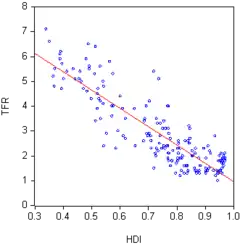 The impact of human development on TFR can best be summarized by a quote from Karan Singh, a former minister of population in India.  At a 1974 United Nations population conference in Bucharest, she said "Development is the best contraceptive."[16]