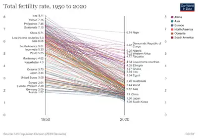 The chart shows that the decline in TFR since the 1960s has occurred in every region of the world and that the global TFR is projected to continue to decline for the remainder of this century.[28]