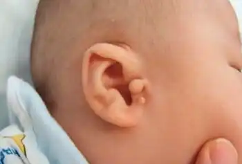 - Abnormalities of the external ears (unusually large or small, unusually shaped, sometimes with sensorineural hearing loss or deafness due to lesions or dysfunctions of part of the internal ear or its nerve tracts and centers or conductive hearing loss from the external or middle ear), dysplastic ears, lop ear (over-folded ear helix), preauricular tags or pits (a rudimentary tag of ear tissue typically located just in front of the ear).