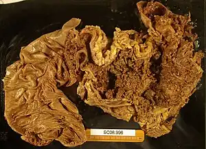 Toxic megacolon is an acute form of colonic distension.[2] It is characterized by a very dilated colon (megacolon), accompanied by abdominal distension (bloating), and sometimes fever, abdominal pain, or shock.