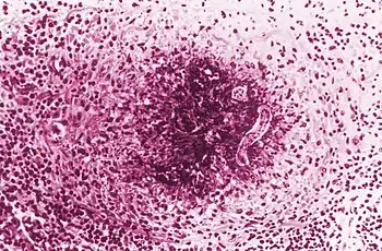 Parasitic loads as high as 300 larvae in a single gram of liver have been noted in humans.[10] The "excretory–secretory antigens of larvae ... released from their outer epicuticle coat [and] ... readily sloughed off when bound by specific antibodies" incite the host's immune response.[5] The tipping point between development of VLM and OLM is believed to be between 100 and 200 larvae.[10] The lighter infection in OLM is believed to stimulate a lower immune response and allow for migration of a larva into the eye. Larvae are thought to enter the eye through the optic nerve, central retinal artery, short posterior ciliary arteries, soft tissues, or cerebrospinal fluid.[10][13] Ocular granulomas that form around a larva typically are peripheral in the retina or optic disc.[13]