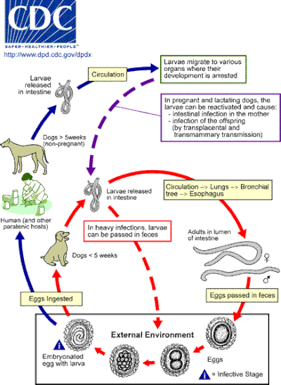- ↑ 22.0 22.1 22.2 22.3 "Toxocariasis". DPDx: Parasites and Health. Centers for Disease Control and Prevention. 2009. Archived from the original on 13 May 2006. Retrieved 7 March 2006.