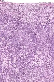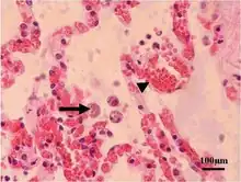 Acute toxoplasmosis is often asymptomatic in healthy adults.[13][14] However, symptoms may manifest and are often influenza-like: swollen lymph nodes, headaches, fever, and fatigue,[15] or muscle aches and pains that last for a month or more. It is rare for a human with a fully functioning immune system to develop severe symptoms following infection. People with weakened immune systems are likely to experience headache, confusion, poor coordination, seizures, lung problems that may resemble tuberculosis or Pneumocystis jiroveci pneumonia (a common opportunistic infection that occurs in people with AIDS), or blurred vision caused by severe inflammation of the retina (ocular toxoplasmosis).[15] Young children and immunocompromised people, such as those with HIV/AIDS, those taking certain types of chemotherapy, or those who have recently received an organ transplant, may develop severe toxoplasmosis. This can cause damage to the brain (encephalitis) or the eyes (necrotizing retinochoroiditis).[16] Infants infected via placental transmission may be born with either of these problems, or with nasal malformations, although these complications are rare in newborns. The toxoplasmic trophozoites causing acute toxoplasmosis are referred to as tachyzoites, and are typically found in bodily fluids.[17][18]