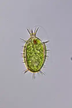 Most species are phototrophic, having a characteristic green colour due to the discoid or flattened, shield-like chloroplast, which usually bears sheathed, projecting or naked pyrenoids.[2][8] The few species that are osmotrophic, lack chloroplasts; therefore, they are colourless.[2] Similar to other euglenoids, the cell has many paramylon bodies that are used for the storage of starch; these can be a distinguishing trait for species with similar lorica structures.[8] The structure and ornamentation of the lorica is very dependent on the growth conditions, especially the availability of nutrients. Therefore, the size, shape, collar form and the presence of spines and pores can vary, showing morphological plasticity within species.[9] This can make it difficult to describe species since morphological features can vary greatly. Trachelomonads also have an eyespot, a feature of photosynthetic euglenoids, located outside the chloroplast with orange to red pigmentation.[8] These cells also have one long emergent flagellum that has previously been identified to emerge from the apical pore, and a shorter flagellum that is within the furrow and not used for motility. Under light microscopy, it is also possible to see condensed chromosomes.[8]