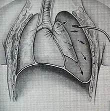 Damage to the airways can cause subcutaneous emphysema (air trapped in the subcutaneous tissue of the skin) in the abdomen, chest, neck, and head.[2] Subcutaneous emphysema, present in up to 85% of people with TBI,[10] is particularly indicative of the injury when it is only in the neck.[13] Air is trapped in the chest cavity outside the lungs (pneumothorax) in about 70% of TBI.[4][10] Especially strong evidence that TBI has occurred is failure of a pneumothorax to resolve even when a chest tube is placed to rid the chest cavity of the air; it shows that air is continually leaking into the chest cavity from the site of the tear.[11] Air can also be trapped in the mediastinum, the center of the chest cavity (pneumomediastinum).[4] If air escapes from a penetrating injury to the neck, a definite diagnosis of TBI can be made.[10] Hamman's sign, a sound of crackling that occurs in time with the heartbeat, may also accompany TBI.[14]