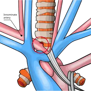 - ↑ 4.0 4.1 4.2 4.3 4.4 Grant, C. A.; Dempsey, G.; Harrison, J.; Jones, T. (2006-01-01). "Tracheo-innominate artery fistula after percutaneous tracheostomy: three case reports and a clinical review". British Journal of Anaesthesia. 96 (1): 127–131. doi:10.1093/bja/aei282. ISSN 0007-0912. PMID 16299043.