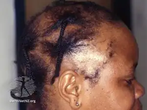 - ↑ Khumalo, N. P. (2012). "The "fringe sign" for public education on traction alopecia". Dermatology Online Journal. 18 (9): 16. PMID 23031383.