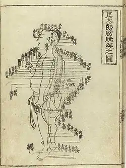 Acupuncture chart from Hua Shou (fl. 1340s, Yuan dynasty). This image from Shisi jingfahui (Expression of the Fourteen Meridians). (Tokyo: Suharaya Heisuke kanko, Kyoho gan 1716).