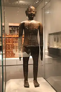 Stone and bone needles found in ancient tombs led Joseph Needham to speculate that acupuncture might have been carried out in the Shang dynasty.[27][28] This being said, most historians now make a distinction between medical lancing (or bloodletting) and acupuncture in the narrower sense of using metal needles to attempt to treat illnesses by stimulating points along circulation channels ("meridians") in accordance with beliefs related to the circulation of "Qi".[27][28][29] The earliest evidence for acupuncture in this sense dates to the second or first century BCE.[25][27][28][30]