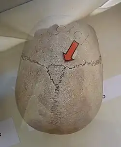 52.28 Tiānlínggài 天靈蓋 "bregma; skullcap; calvaria" is translated as "human skull",[5] "human skull top",[7] and "bregma".[6] In Daoist meditation and qigong breathing practices, the bregma is considered the locus of the upper dantian "elixir field". Li Shizhen says, "The skull of a human looks like a round cover. It is shaped like the sky. It is the palace of Niwan" – níwán 泥丸 "clay pellet" is a Chinese transcription of "nirvana".[15] Furthermore, "It is a place where ancestral wisdom is stored. Taoist alchemists stimulate the Li (Fire) by Kan (Water) so as to restore its condition of pure Qian (Yang). In this way, a sacred fetus will form. Then it may go out and come back in as it wishes. So the top of the skull is called Tianlinggai (meaning "cover of the Heavenly wisdom")." This shèngtāi 聖胎 "sacred embryo/fetus; Embryo of Sainthood" denotes achieving xian immortality through neidan "internal alchemy". Cooper & Sivin say drilling the skull in order to provide a passage is still part of the initiation ritual for members of the esoteric Shingon sect in Taiwan today.[16]