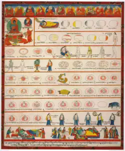 Later in the 11th and 12th centuries, a number of additional Indian medical texts were also transmitted.[8] While the Ayurvedic Astāngahrdayasamhitā or the Heart of Medicine Compendium attributed to Vagbhata was translated into Tibetan by Rinchen Zangpo (རིན་ཆེན་བཟང་པོ།) (957–1055),[9] Ayurvedic practices had already been adopted in the 8th century by the Tibetan medical Council. Tibet had also absorbed the early Indian Abhidharma literature, for example the 5th century Abhidharmakosasabhasyam by Vasubandhu, which expounds upon medical topics, such as fetal development.[10] A wide range of Indian Vajrayana tantras, containing practices based on medical anatomy, had likewise been adopted by Tibet.[11][12]