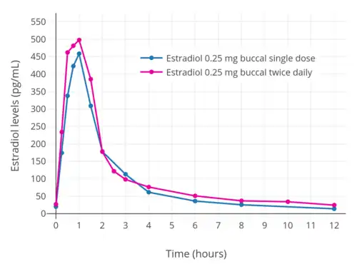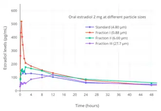 Estradiol can be taken by a variety of different routes of administration.[10] These include oral, buccal, sublingual, intranasal, transdermal (gels, creams, patches), vaginal (tablets, creams, rings, suppositories), rectal, by intramuscular or subcutaneous injection (in oil or aqueous), and as a subcutaneous implant.[10] The pharmacokinetics of estradiol, including its bioavailability, metabolism, biological half-life, and other parameters, differ by route of administration.[10] Likewise, the potency of estradiol, and its local effects in certain tissues, most importantly the liver, differ by route of administration as well.[10] In particular, the oral route is subject to a high first-pass effect, which results in high levels of estradiol and consequent estrogenic effects in the liver and low potency due to first-pass hepatic and intestinal metabolism into metabolites like estrone and estrogen conjugates.[10] Conversely, this is not the case for parenteral (non-oral) routes, which bypass the intestines and liver.[10]