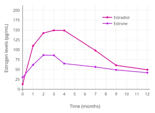 Different estradiol routes and dosages can achieve widely varying circulating estradiol levels (see the table below).[10] For purposes of comparison with normal physiological circumstances, menstrual cycle circulating levels of estradiol in premenopausal women are 40 pg/mL in the early follicular phase, 250 pg/mL at the middle of the cycle, and 100 pg/mL during the mid-luteal phase.[15] Mean integrated levels of circulating estradiol in premenopausal women across the whole menstrual cycle are in the range of 80 to 150 pg/mL, according to some sources.[16][17][18] In postmenopausal women, circulating levels of estradiol are below 15 pg/mL.[10][15] During normal human pregnancy, estrogen production increases progressively and extremely high estrogen levels are attained.[19] Estradiol levels range from 1,000 to 40,000 pg/mL across pregnancy,[20] are on average 25,000 pg/mL at term, and reach levels as high as 75,000 pg/mL in some women.[21]